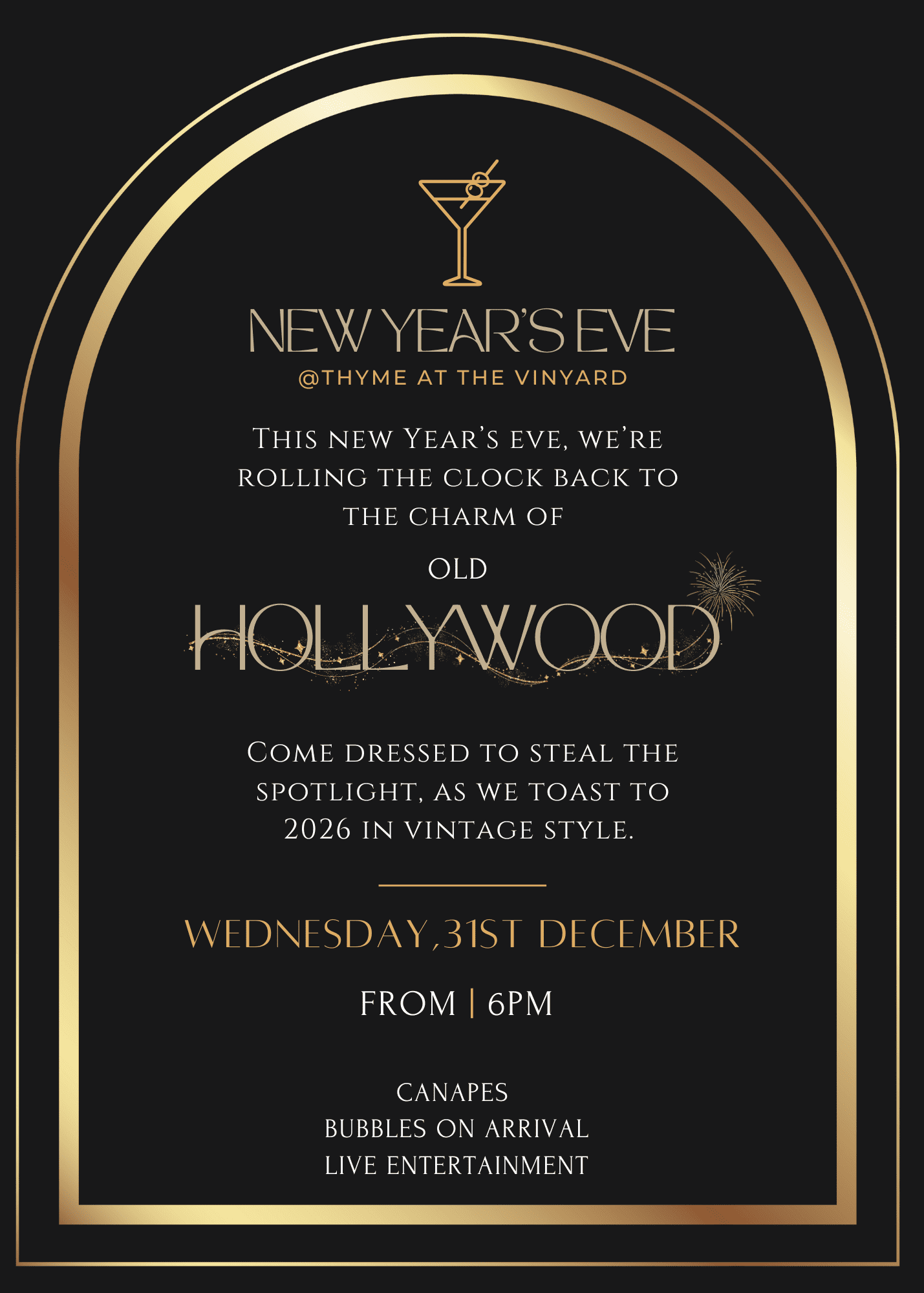 Step into a world of classic sophistication this New Year’s Eve at Thyme at the Vinyard, where we celebrate the arrival of 2026 with the timeless allure of Old Hollywood. Sparkling lights, elegant décor and vintage charm set the scene for an evening inspired by cinema’s golden era.